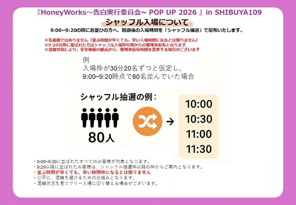 1月30日(金)~2月1日(日)の3日間は会場の混雑が予想されるため、「シャッフル整理券」の配布を予定しております。