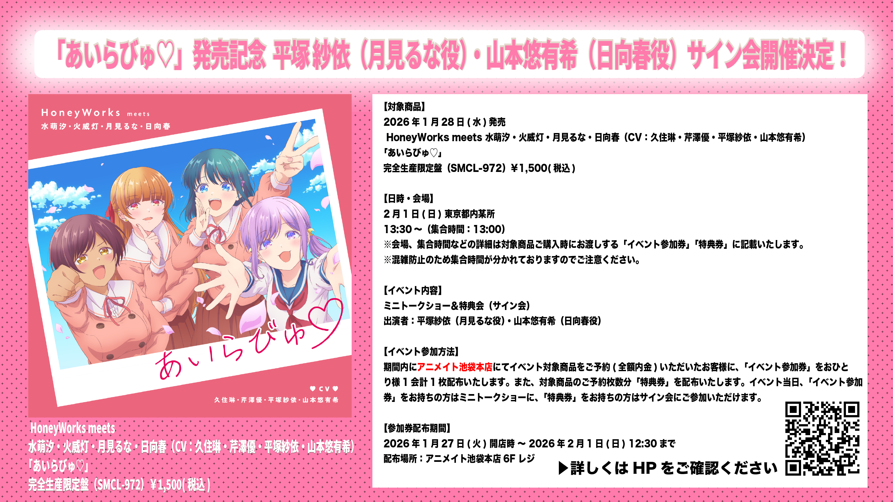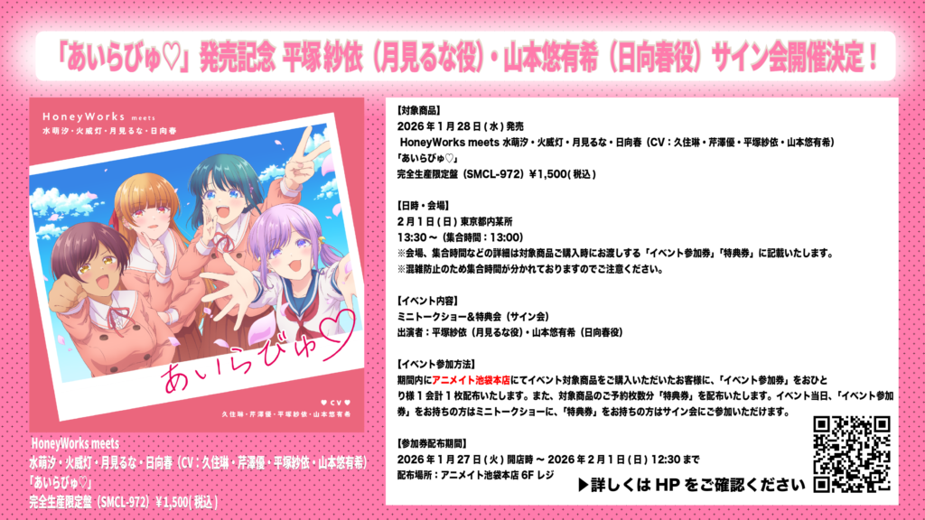 2026年1月28日(水)発売 HoneyWorks meets 水萌汐・火威灯・月見るな・日向春(CV:久住琳・芹澤優・平塚紗依・山本悠有希)「あいらびゅ♡」の発売を記念して、