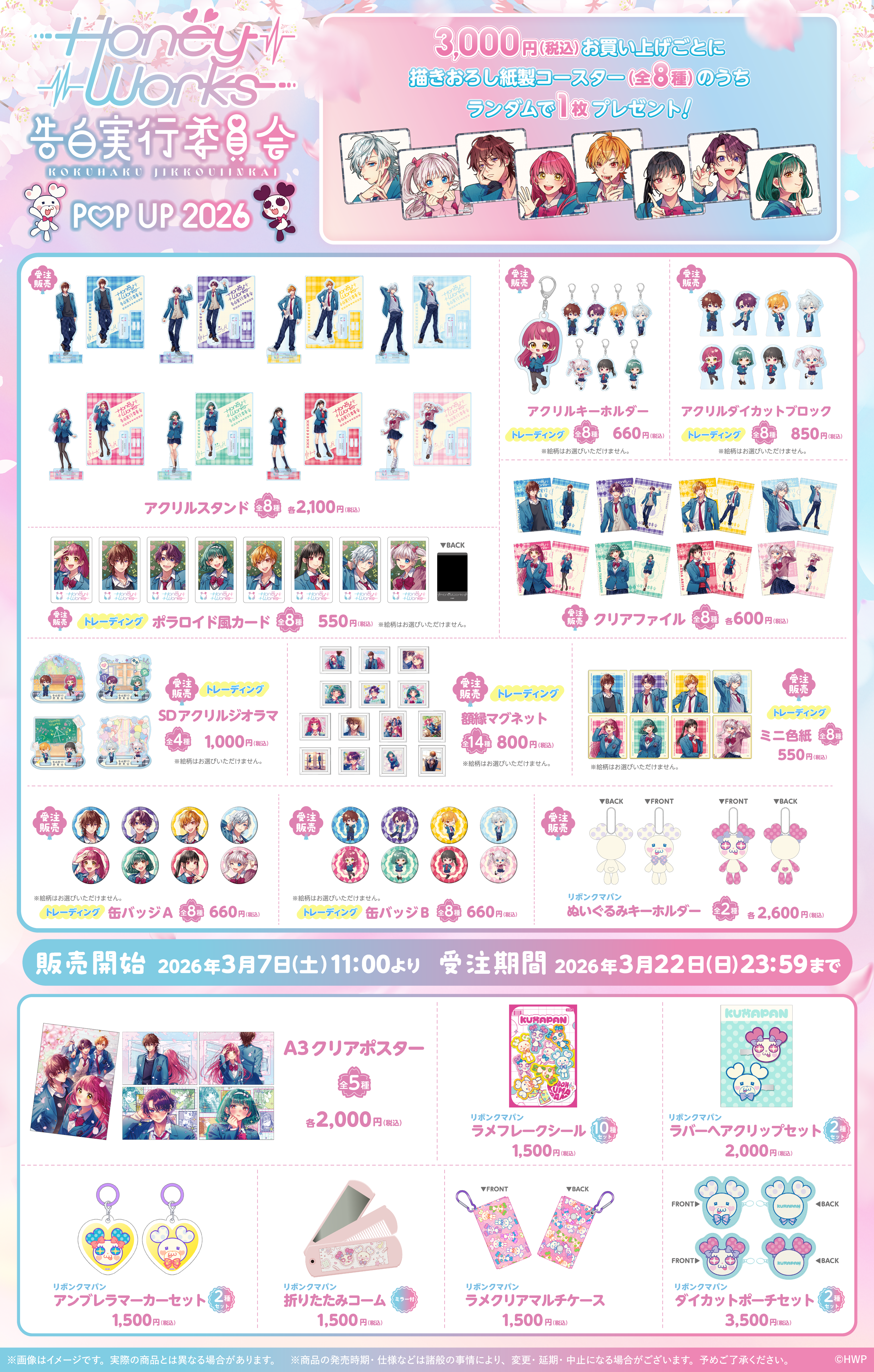 『HoneyWorks~告白実行委員会~ POP UP 2026』グッズが、3月7日(土)11:00よりHoneyWorks公式通販サイトにて受注販売が決定いたしました!